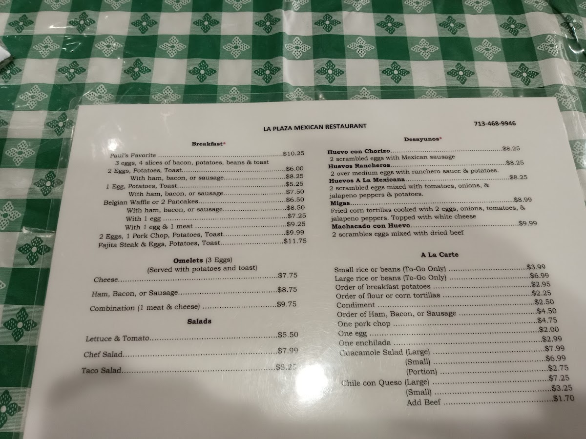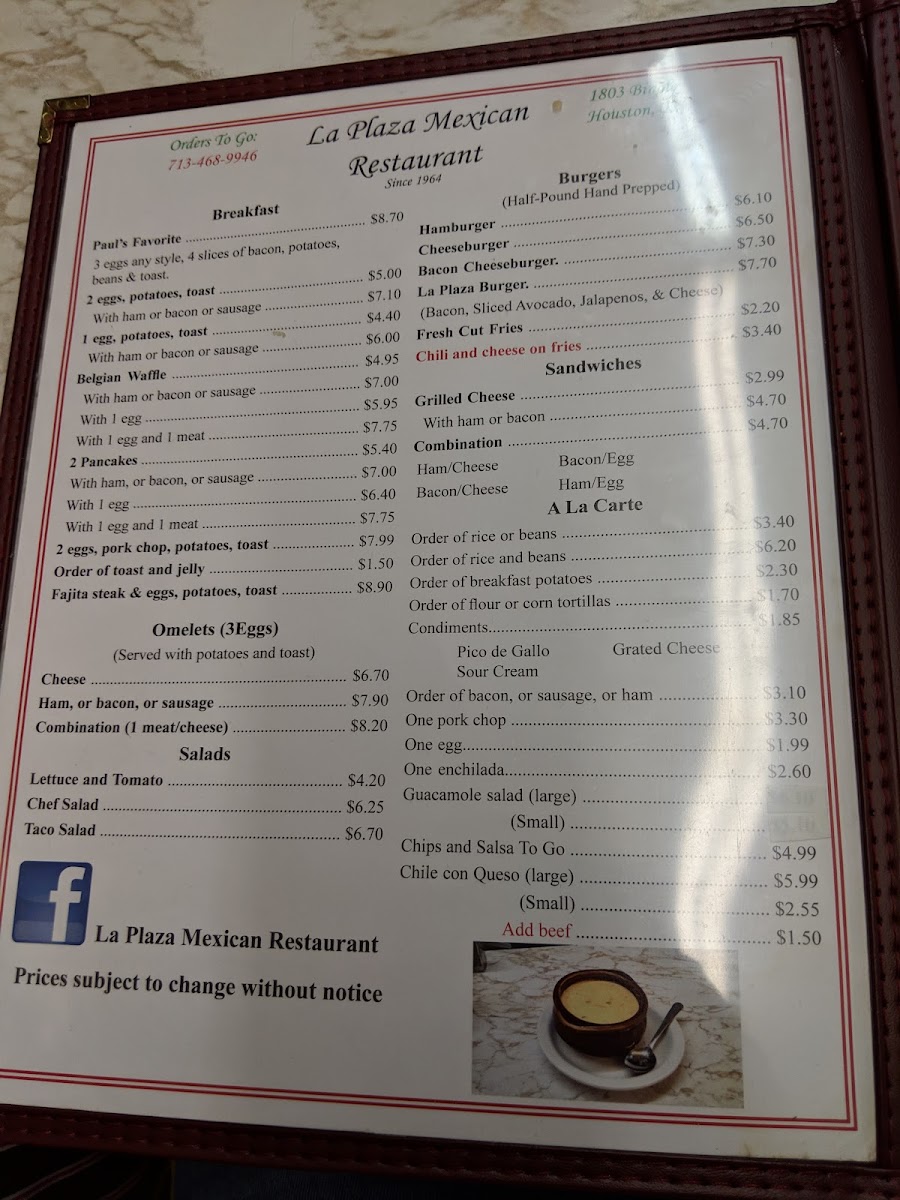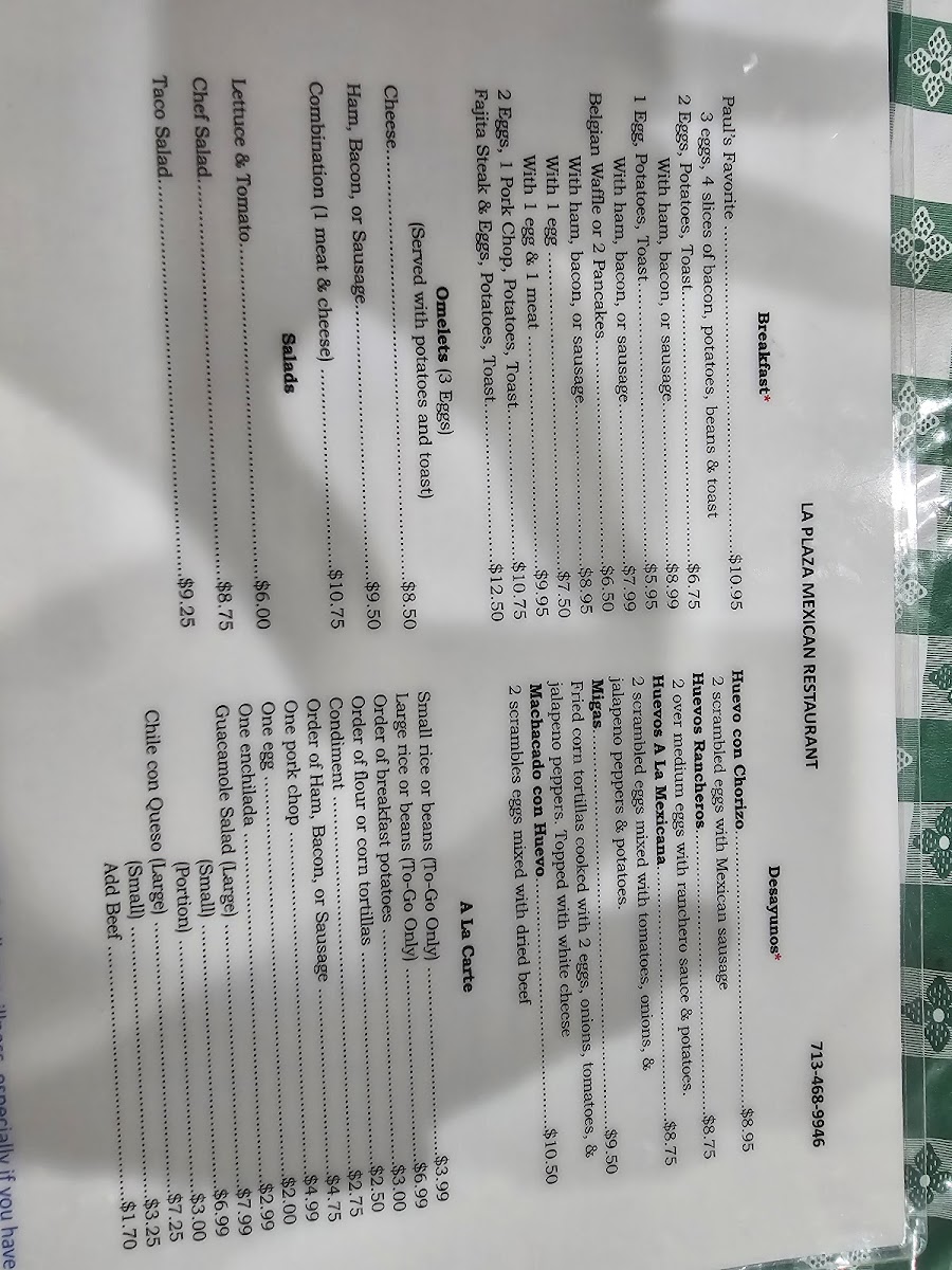 The menu at La Plaza Mexican Restaurant offers a diverse selection of Mexican and American dishes, including breakfast items served throughout the day. It is designed to accommodate a variety of dining needs, from quick breakfast options to more substantial lunch or dinner plates.