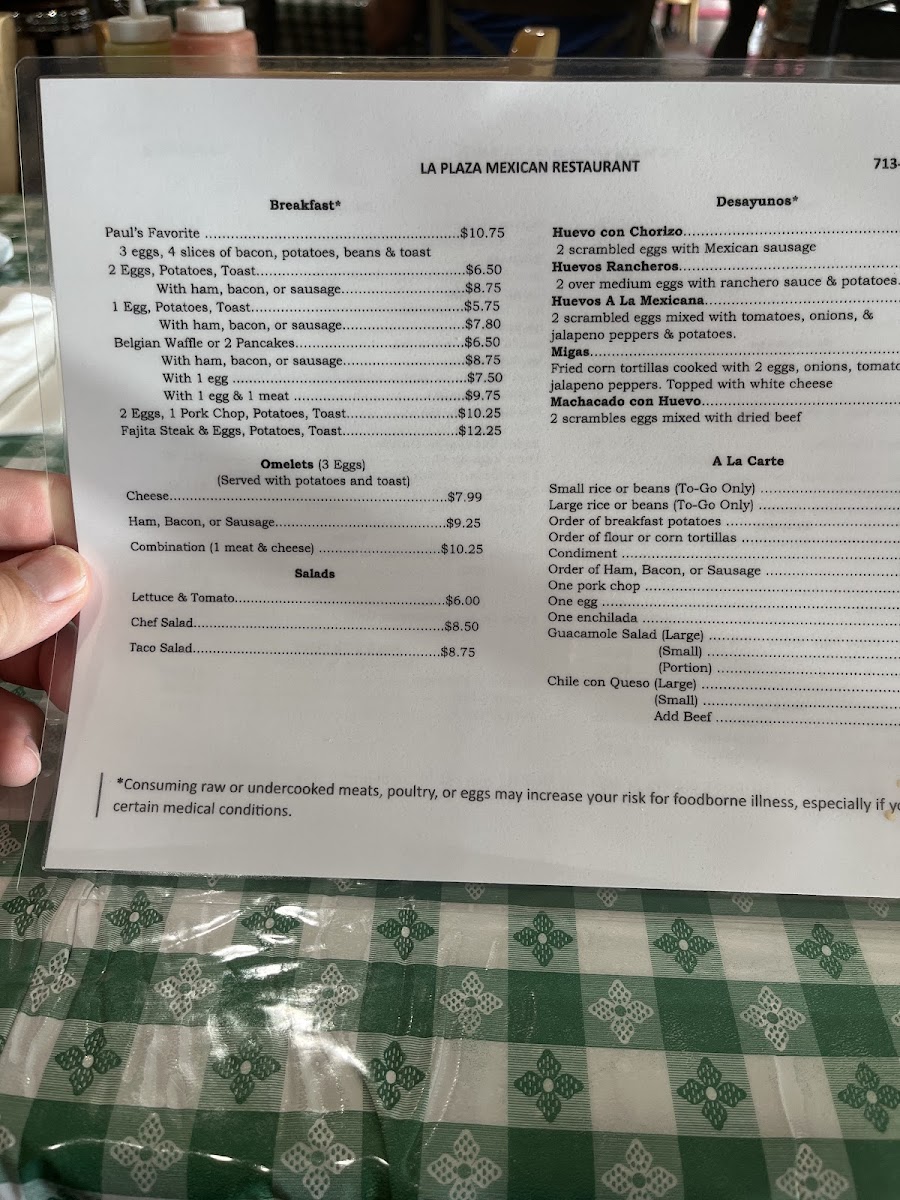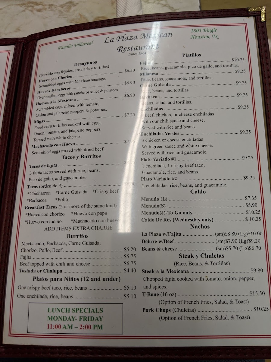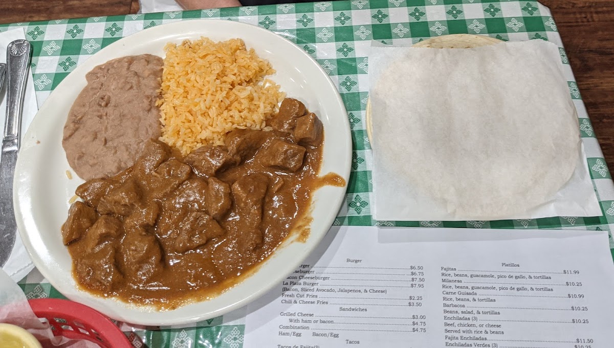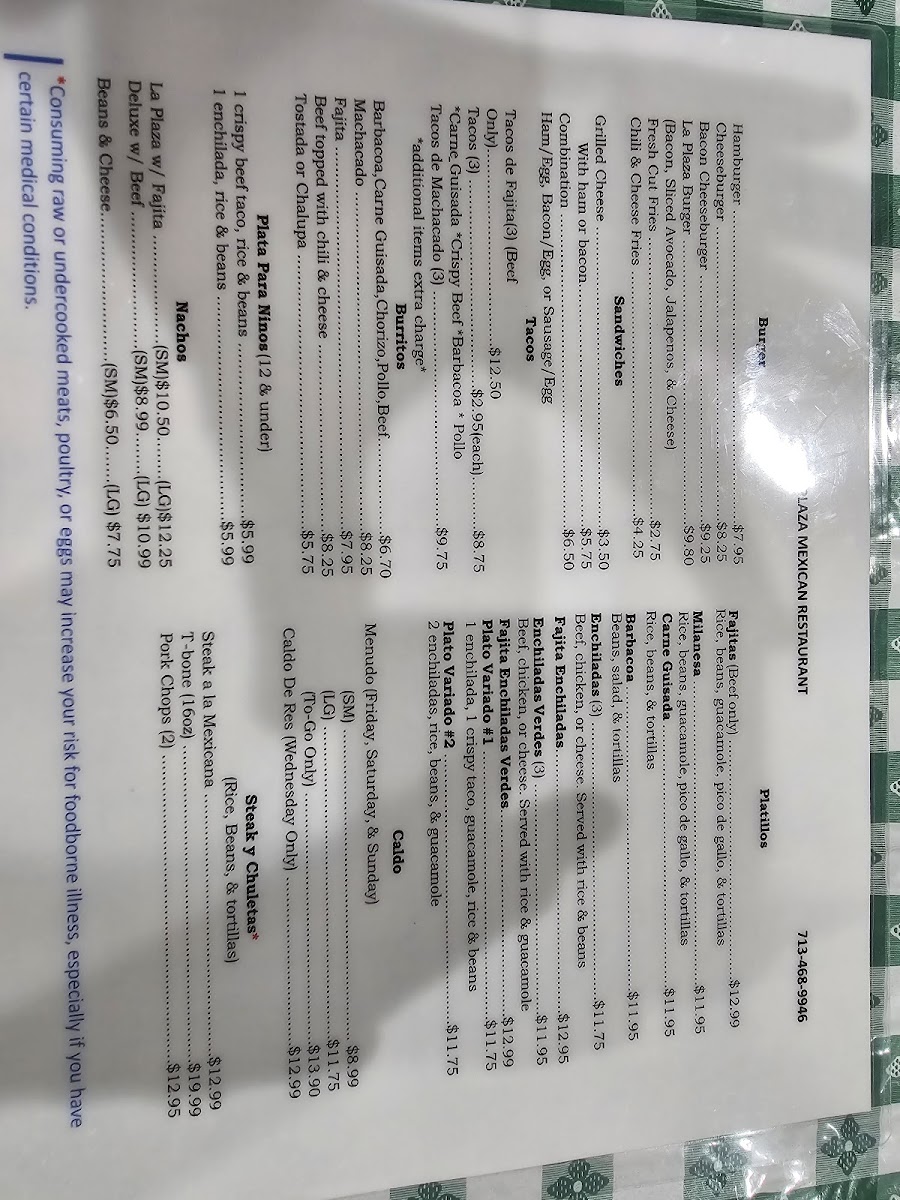 The menu at La Plaza Mexican Restaurant offers a diverse selection of Mexican and American dishes, including breakfast items served throughout the day. It is designed to accommodate a variety of dining needs, from quick breakfast options to more substantial lunch or dinner plates.