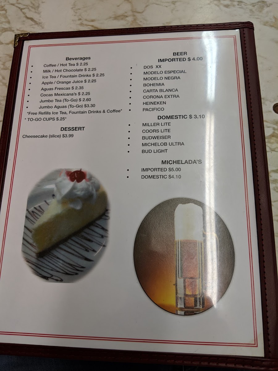 - Breakfast: Includes traditional Mexican breakfast plates such as Menudo, Migas, Huevos Ala Mexicana, Chilaquiles, Breakfast Tacos, and various egg dishes including a Cheese Omelet prepared with egg whites only. Breakfast options are available all day to suit early meals or casual dining.
