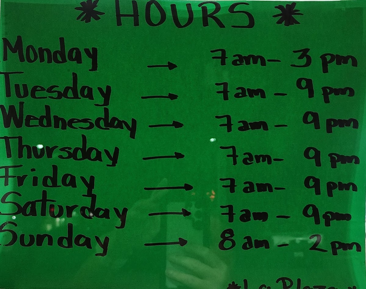 - Burgers and Sides: Includes hamburgers, cheeseburgers, and specialty options such as the La Plaza Burger topped with bacon, sliced avocado, jalapenos, and cheese. Sides like fresh cut fries and chili and cheese fries complement these dishes.